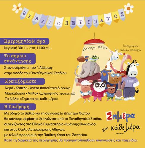 Η συγγραφέας Δήμητρα Φώτου, με αφορμή την έκδοση του βιβλίου της «Σήμερα και κάθε μέρα», σε εικονογράφηση της Ναταλίας Καπατσούλια, διοργανώνει περιπάτους που συνδυάζουν το παιχνίδι με την ανάγνωση. Μια όμορφη κυριακάτικη απόδραση στην πόλη, εμπλουτισμένη με φιλαναγνωστικές δραστηριότητες για τα παιδιά.