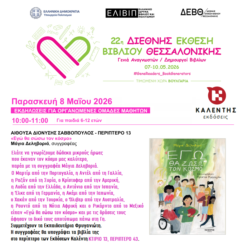 22η Διεθνής Έκθεση Βιβλίου Θεσσαλονίκης: Η συγγραφέας Μάγια Δεληβοριά παρουσιάζει το νέο της βιβλίο «Εγώ θα σώσω τον κόσμο», σε εικονογράφηση του Χρήστου Κούρτογλου. Calendar Προσθήκη στο Ημερολόγιο Προσθήκη σε Timely Ημερολόγιο Προσθήκη σε Google Προσθέστε στο Outlook Προσθέστε στο Apple ημερολόγιο Προσθέστε σε άλλα ημερολόγια Export to XML Πότε: 08/05/2026 @ 10:00 – 11:00 2026-05-08T10:00:00+03:00 2026-05-08T11:00:00+03:00 Συμμετέχουν τα Εκπαιδευτήρια Φρυγανιώτη. Η συγγραφέας θα υπογράψει τα βιβλία της στο περίπτερο 43 (Κτίριο 13) των Εκδόσεων Καλέντη. Πλοήγηση άρθρωνΠροηγούμενο: 22η Διεθνής Έκθεση Βιβλίου Θεσσαλονίκης: Μουσικοκινητικά παιχνίδια με τη συγγραφέα Μάρω Σφακιανοπούλου βασισμένα στο βιβλίο της «Μάστορας συγγνώμης».Επόμενο: Οι εκδόσεις Καλέντη στα εκπαιδευτήρια Καντά. Παρουσίαση του βιβλίου «Εγώ θα σώσω τον κόσμο» της Μάγιας Δεληβοριά (10.00 π.μ.-14.00 μ.μ.).