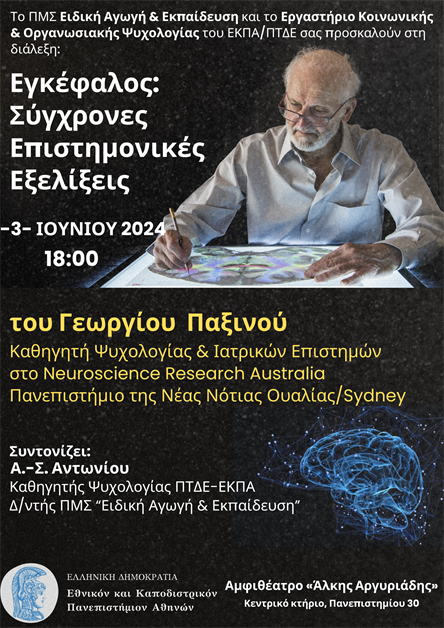 Διάλεξη του Δρ. Γιώργου Παξινού με τίτλο: «Εγκέφαλος: Σύγχρονες επιστημονικές ανακαλύψεις». Οργάνωση: ΠΜΣ Ειδική Αγωγή & Εκπαίδευση, Εργαστήριο Κοινωνικής & Οργανωσιακής Ψυχολογίας του ΕΚΠΑ/ΠΤΔΕ Calendar Προσθήκη στο Ημερολόγιο Προσθήκη σε Timely Ημερολόγιο Προσθήκη σε Google Προσθέστε στο Outlook Προσθέστε στο Apple ημερολόγιο Προσθέστε σε άλλα ημερολόγια Export to XML Πότε: 03/06/2024 @ 18:00 2024-06-03T18:00:00+03:00 2024-06-03T18:15:00+03:00 Πλοήγηση άρθρωνΠροηγούμενο: Αφηγηματικό δρώμενο από την Εύη Γεροκώστα, βασισμένο στο βιβλίο του Χρ. Μπουλώτη «Ο καυχησιάρης κόκορας που ήθελε να γίνει πλανητάρχης» στο Ελληνοαμερικανικό Κολλέγιο Αθηνών Λάτσειο (Κάντζα)Επόμενο: 3ο Φεστιβάλ Βιβλίου Χανίων – «Ταξιδεύοντας με τη φαντασία»