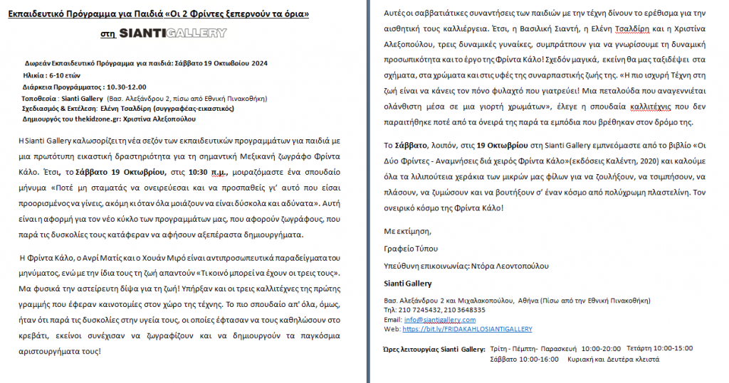 Εκπαιδευτικό πρόγραμμα για παιδιά «Οι 2 Φρίντες ξεπερνούν τα όρια» στη Sianti Gallery, βασισμένο στο βιβλίο «Οι δύο Φρίντες – Αναμνήσεις διά χειρός Φρίντα Κάλο» Calendar Προσθήκη στο Ημερολόγιο Προσθήκη σε Timely Ημερολόγιο Προσθήκη σε Google Προσθέστε στο Outlook Προσθέστε στο Apple ημερολόγιο Προσθέστε σε άλλα ημερολόγια Export to XML Πότε: 19/10/2024 @ 10:30 2024-10-19T10:30:00+03:00 2024-10-19T10:45:00+03:00 Πλοήγηση άρθρωνΠροηγούμενο: Η Εύη Γεροκώστα («Το κλουβί με τα όνειρα») επισκέπτεται τον παιδικό σταθμό-νηπιαγωγείο «Αγγελουλούδια»Επόμενο: Η Μελίνα Ηλιοπούλου και η Καλυψώ Γούλα («Φανταστική βόλτα στη Θεσσαλονίκη») επισκέπτονται τα Εκπαιδευτήρια Φρυγανιώτη