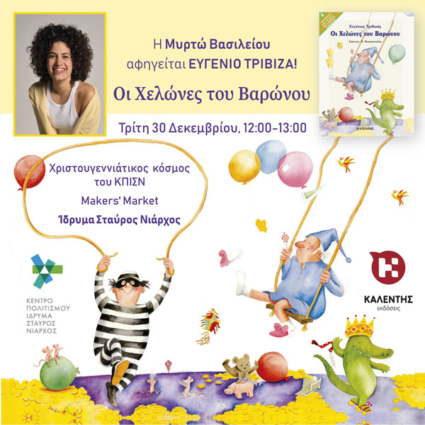 «Οι χελώνες του βαρώνου» του Ευγένιου Τριβιζά στο Ίδρυμα Σταύρος Νιάρχος – Αφήγηση από τη Μυρτώ Βασιλείου Calendar Προσθήκη στο Ημερολόγιο Προσθήκη σε Timely Ημερολόγιο Προσθήκη σε Google Προσθέστε στο Outlook Προσθέστε στο Apple ημερολόγιο Προσθέστε σε άλλα ημερολόγια Export to XML Πότε: 30/12/2025 @ 12:00 2025-12-30T12:00:00+02:00 2025-12-30T12:15:00+02:00 Πλοήγηση άρθρωνΠροηγούμενο: Η Μαριβίτα Γραμματικάκη αφηγείται τη χριστουγεννιάτικη ιστορία της «Εγώ το ξωτικό» στο Ίδρυμα Σταύρος ΝιάρχοςΕπόμενο: Δράση με σχολικές ομάδες, στη Βιβλιοθήκη του Πολιτιστικού Ιδρύματος Ομίλου Πειραιώς, με αφορμή το βιβλίο στο βιβλίο της Μαρίας Ανδρικοπούλου «Δάσκαλος σε δύο ρόδες», στο πλαίσιο της Διεθνούς Ημέρας για την Εκπαίδευση