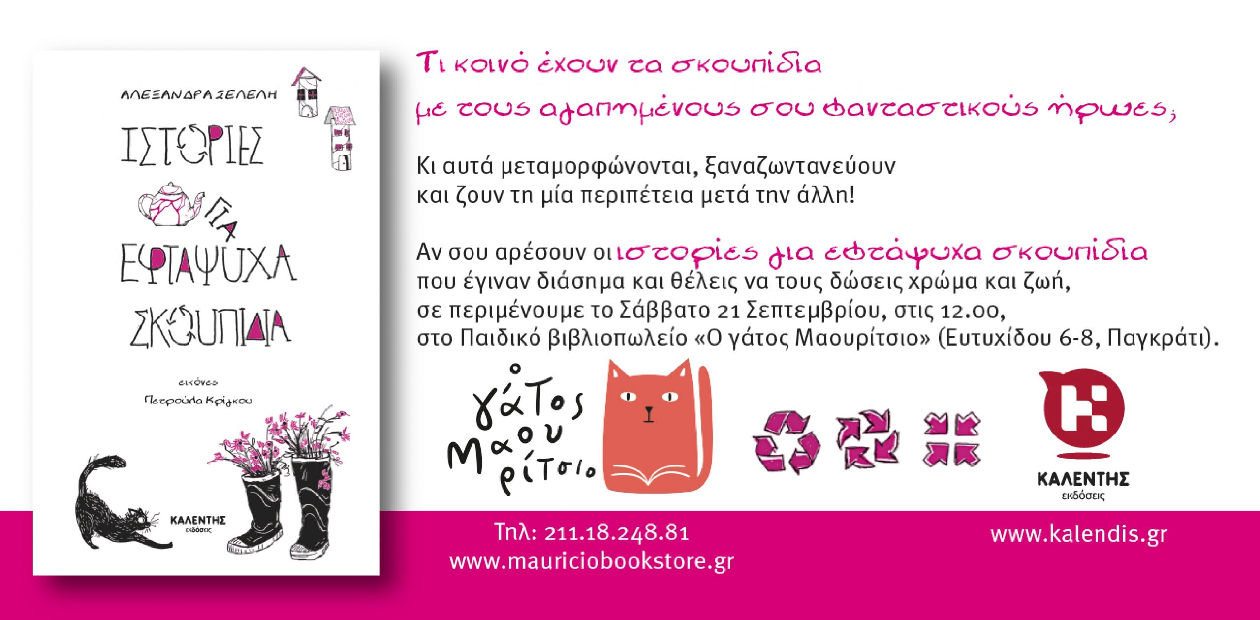 Παρουσίαση του βιβλίου «Ιστορίες για εφτάψυχα σκουπίδια» της Αλεξάνδρας Σέλελη στο βιβλιοπωλείο «Ο γάτος Μαουρίτσιο» Calendar Προσθήκη στο Ημερολόγιο Προσθήκη σε Timely Ημερολόγιο Προσθήκη σε Google Προσθέστε στο Outlook Προσθέστε στο Apple ημερολόγιο Προσθέστε σε άλλα ημερολόγια Export to XML Πότε: 21/09/2024 @ 12:00 2024-09-21T12:00:00+03:00 2024-09-21T12:15:00+03:00 Πλοήγηση άρθρωνΠροηγούμενο: Έκθεση Βιβλίου, Πλατεία Σουρμένων (Ελληνικό): Η Γιώτα Αλεξάνδρου υπογράφει το νέο εικονογραφημένο βιβλίο της «Μια σταγόνα ομορφιάς» στο περίπτερο 8 των Εκδόσεων ΚαλέντηΕπόμενο: Παρουσίαση του βιβλίου «Φανταστική βόλτα στη Θεσσαλονίκη» της Μελίνας Ηλιοπούλου στο παιδικό βιβλιοπωλείο «Ο γάτος Μαουρίτσιο»