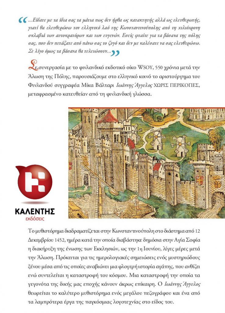Ένα από τα πιο διάσημα ιστορικά μυθιστορήματα με θέμα το Βυζάντιο και την άλωση της Κωνσταντινούπολης από τους Οθωμανούς Τούρκους, δημοσιευμένο στα Φινλανδικά το 1952 (ακριβώς 500 χρόνια μετά το 1453), γνωστό και ως «Ο μαύρος άγγελος». Εξαιρετική η αφηγηματική τεχνική και η καθαρή, λιτή γραφή του Βαλτάρι.